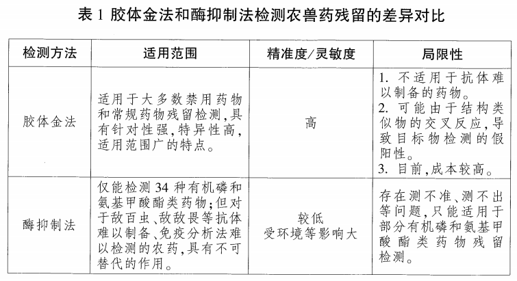 20世纪90年代以来,酶抑制法速测在我国基层监管机构普及应用,在防止有机磷和氨基甲酸酯类农药超标等方面发挥了重要作用。近些年,随着高毒农药陆续被禁用或制定严格的残留限量标准,以及大量其他类型常规农药登记使用,酶抑制法对禁用农药因灵敏度不够“检不准”、对常规农药因方法原理不适用“检不出”的问题逐步凸显,胶体金速测法成为新时期实施农兽药残留精准管控的重要手段。