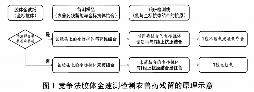 竞争法胶体金速测实际上就是农兽药残留和检测线(T线)上的抗原竞争与金标抗体的结合“名额”。胶体金试纸条上有预先吸附的金标抗体,这些金标抗体正常情况下将与T线上的抗原结合显红色,但样品中如有待测的农兽药残留,则会先一步和金标抗体结合,被结合的金标抗体无法再与T线上的抗原结合显色,导致T线最终不显色或显色变弱。待测的农兽药残留浓度越高,T线显色越浅,因此理论上通过T线显色程度,可以计算出待测农兽药残留浓度,一定程度达到定量检测效果。